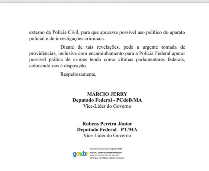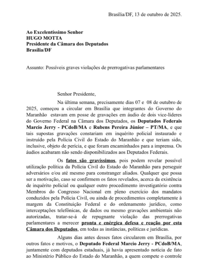 Os deputados federais Márcio Jerry (PCdoB-MA) e Rubens Pereira Júnior (PT-MA), ambos vice-líderes do governo na Câmara dos Deputados, protocolaram nesta segunda-feira (13) um pedido de investigação junto ao presidente da Câmara, Hugo Motta, denunciando a existência de uma suposta escuta telefônica ilegal envolvendo seus nomes.