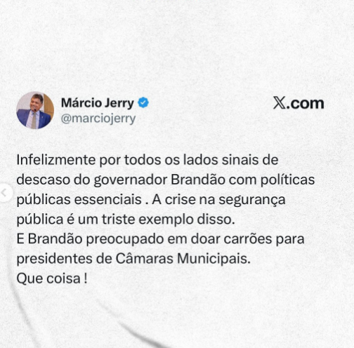 Em publicações nas redes sociais, Jerry acusou o governo de negligência e cobrou uma resposta imediata. Segundo o parlamentar, há “sinais de descaso” com políticas públicas essenciais, especialmente na área da segurança.