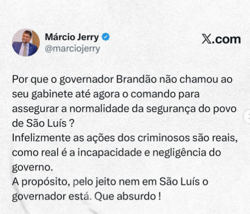 O deputado federal Márcio Jerry (PCdoB) fez duras críticas ao governador Carlos Brandão (PSB) em meio à onda de violência que assusta São Luís há mais de uma semana. A capital maranhense enfrenta uma guerra entre facções criminosas por território, com mortes, tiroteios e pânico generalizado.