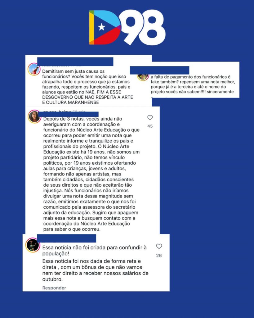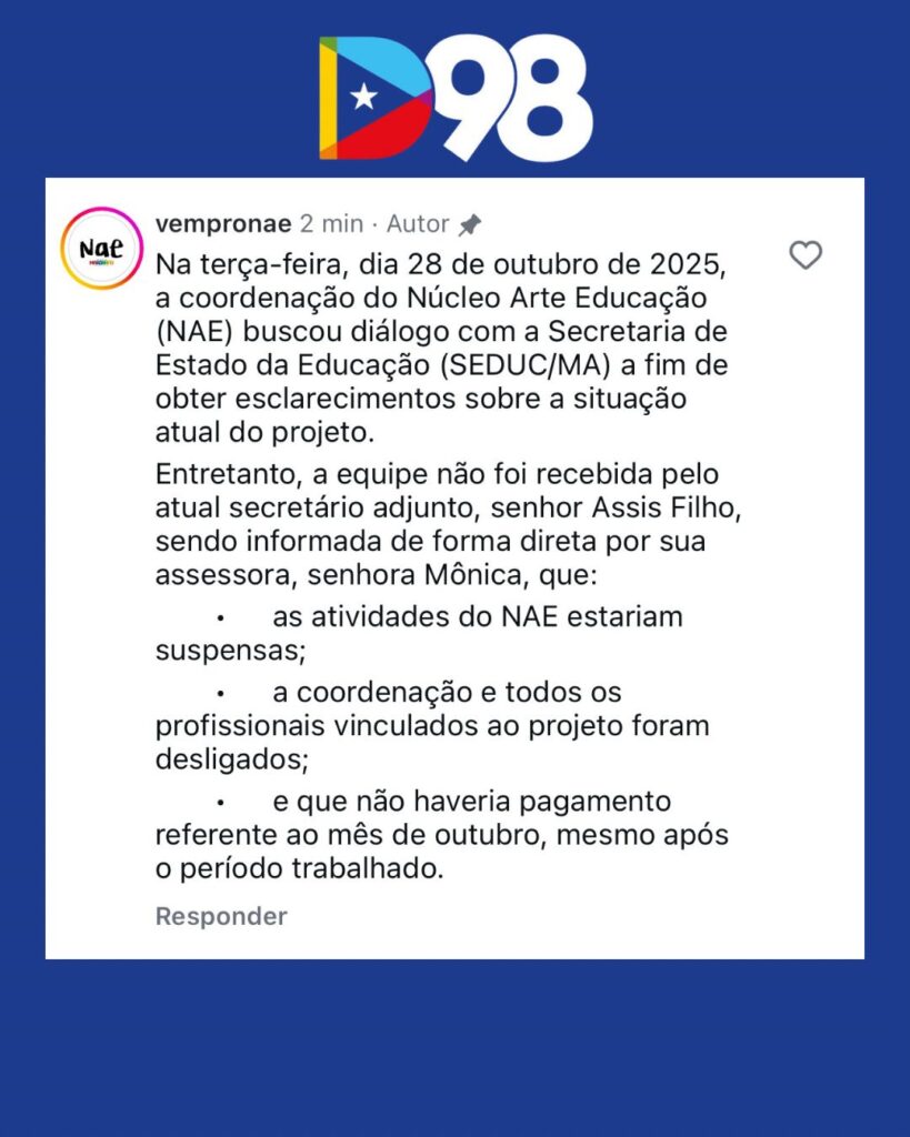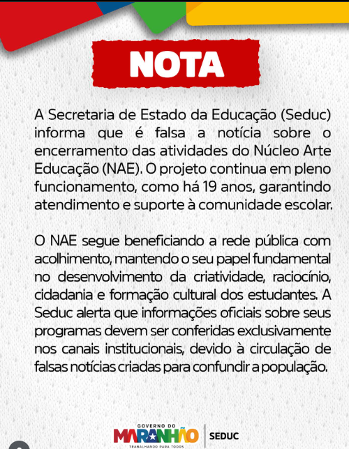 “Nós, educadores, equipe de profissionais e membros da comunidade artística de São Luís do Maranhão, manifestamos nosso profundo repúdio às decisões unilaterais tomadas pela Secretaria de Estado da Educação do Maranhão (SEDUC/MA), que resultaram no cancelamento das atividades do projeto Núcleo Arte Educação (NAE).”