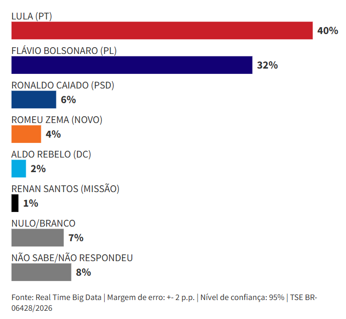 A pesquisa foi realizada pelo Real Time Big Data com 2.000 eleitores, distribuídos em todas as regiões do país, garantindo representatividade nacional. As entrevistas foram feitas de forma presencial, entre os dias 6 e 7 de fevereiro de 2026.