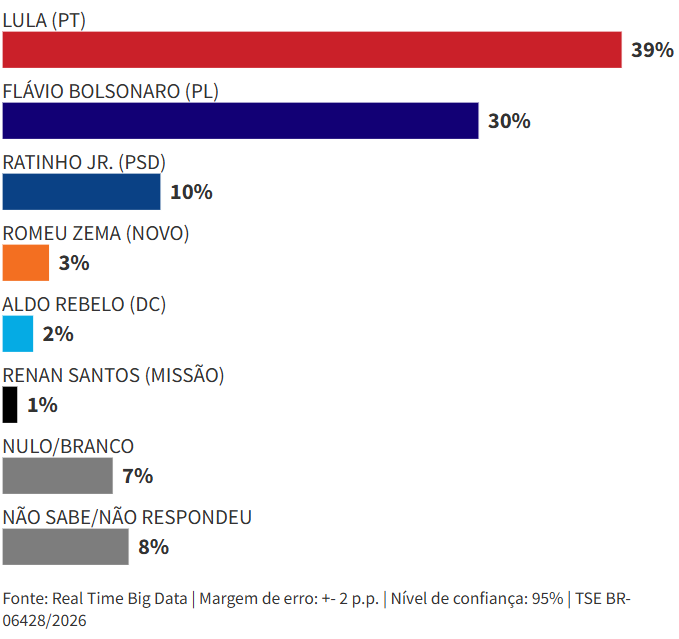 No primeiro cenário, que inclui o governador do Paraná, Ratinho Júnior (PSD), Lula aparece com 39% das intenções de voto, contra 30% de Flávio Bolsonaro. Ratinho Jr. soma 10%, enquanto os demais candidatos ficam bem atrás, com percentuais entre 1% e 3%. Votos brancos e nulos representam 7%, e 8% dos entrevistados disseram não saber ou preferiram não responder.