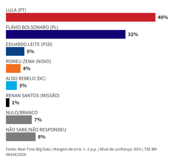 A pesquisa do instituto Real Time Big Data sobre a corrida presidencial de 2026, divulgada nesta segunda-feira (9/2), mostra o presidente Luiz Inácio Lula da Silva (PT) na liderança das intenções de voto em todos os cenários avaliados para o primeiro turno. O levantamento simulou disputas diretas com o senador Flávio Bolsonaro (PL-RJ) e diferentes nomes do PSD, partido comandado por Gilberto Kassab.