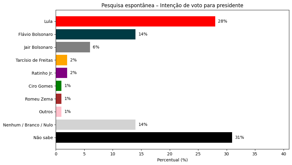 Além dos cenários estimulados, o levantamento do Real Time Big Data também avaliou a intenção de voto espontânea, quando o entrevistado responde livremente, sem receber uma lista de candidatos.