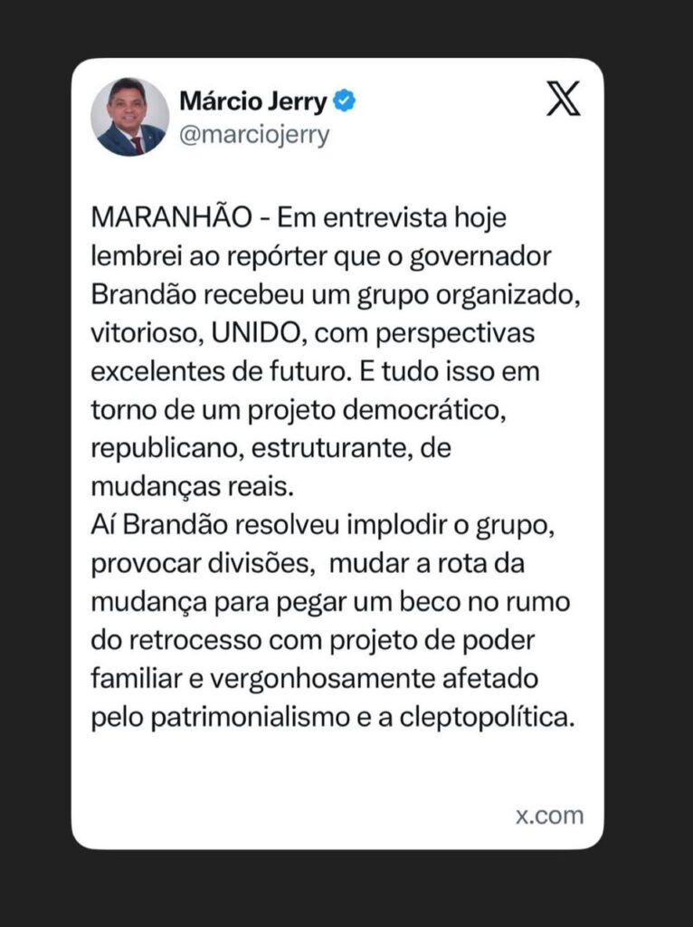 De acordo com Márcio Jerry, Brandão recebeu “um grupo organizado, vitorioso e unido, com perspectivas excelentes de futuro”, construído em torno de um projeto democrático, republicano e estruturante, voltado para mudanças reais no Maranhão. No entanto, o deputado afirmou que o governador optou por seguir um caminho oposto ao esperado.
