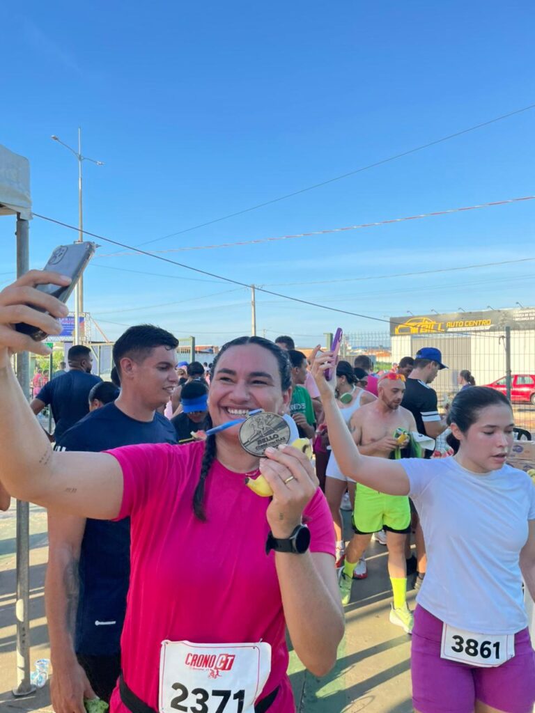 A chegada foi um dos pontos altos da corrida. Cada participante que cruzava a linha de chegada recebia sua medalha e celebrava a conquista, reforçando o espírito de superação e celebração coletiva que marcou toda a prova.