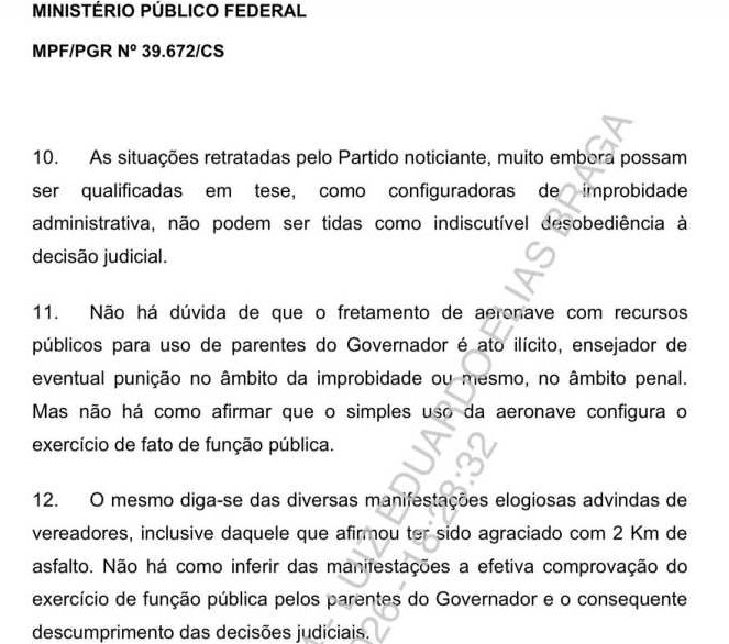 Em manifestação enviada ao Supremo Tribunal Federal (STF) nesta segunda-feira (30), a Procuradoria-Geral da República (PGR) afirmou que atos praticados pela gestão estadual configuram, em tese, crimes e atos de improbidade administrativa. O parecer da subprocuradora-geral Cláudia Sampaio Marques destaca que episódios como o uso de aviões fretados pelo Estado por parentes do governador Carlos Brandão são atos ilícitos que reclamam devida apuração nas esferas penal e cível.